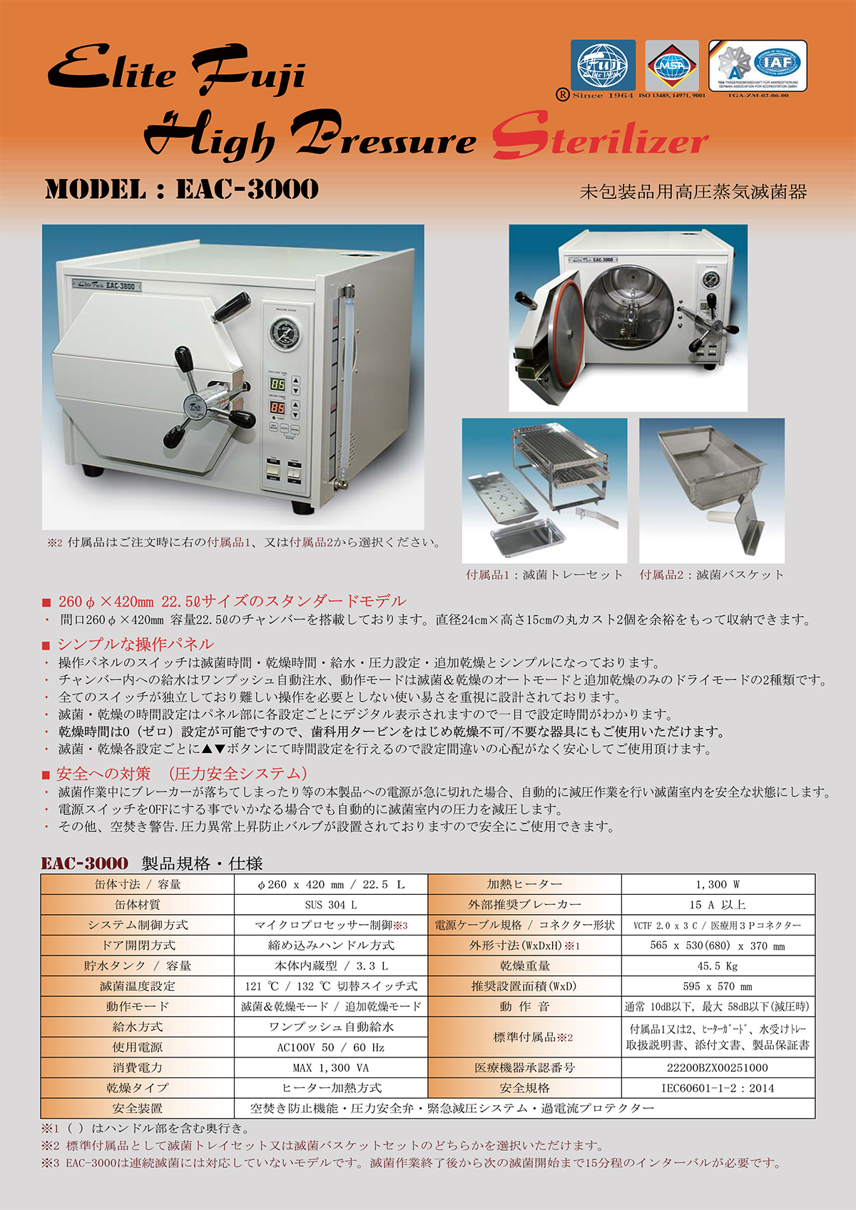 TOP > 製品情報 > オートクレーブ(高圧蒸気滅菌器) > EAC-3000(260φ 22.5L)